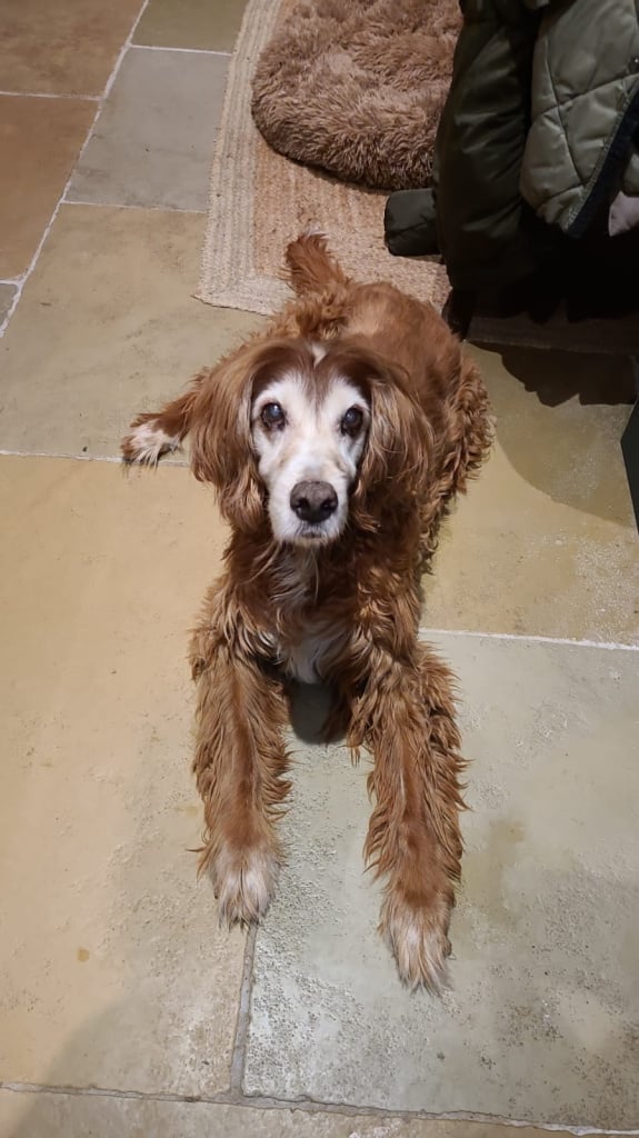 Himself and Coco became best friends for life. When it was her time 3 years ago he sat minding her for the last few days before we said goodbye. He became less mobile in his final years, he had arthritis in his front shoulder, he also had bronchial COPD so had an inhaler for cough flare ups. But in the last couple of months of his life the cough changed slightly, and couldn't be cleared with the usual dose of steroids. His heart started racing and when the vets managed to do an Xray they found a large mass on his chest putting pressure on his heart and lungs and even his windpipe. The vets said it would be weeks, not months so we set about his bucket list which was mostly food related. Steak for breakfast, his own turkey for Christmas, special fried rice from the Chinese. His last trip to the beach was on New Years Day, 4 days before we let him go. He had a little paddle, barked at the birds and then sat up on grass verge taking in the air. On the Friday night he was eating chicken out of my hand at 11pm, little did I know the following morning his heart - which had been almost beating out of his chest for the previous few weeks - would fail, and he began to have breathing difficulties. He shuffled out to the garden for a last wee, sat down in the frosty grass and gave us the look.
