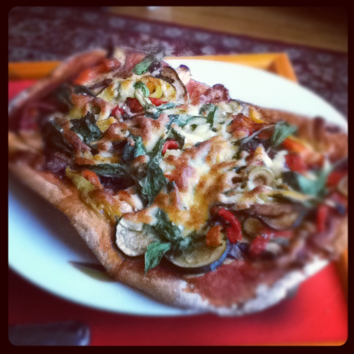 This afternoon I had a Pizza-Pizza flavoured tofu fillet, fried with a tomato and baby leaf salad.