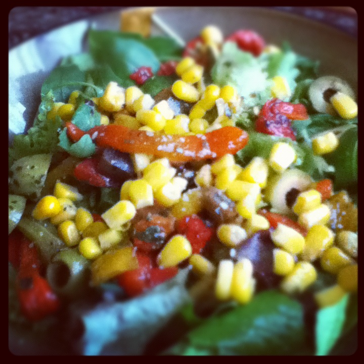 served with a homegrown mixed leave salad with roasted peppers green olives and sweetcornans used the oil from the peppers mixed with some balsamic as the dressing