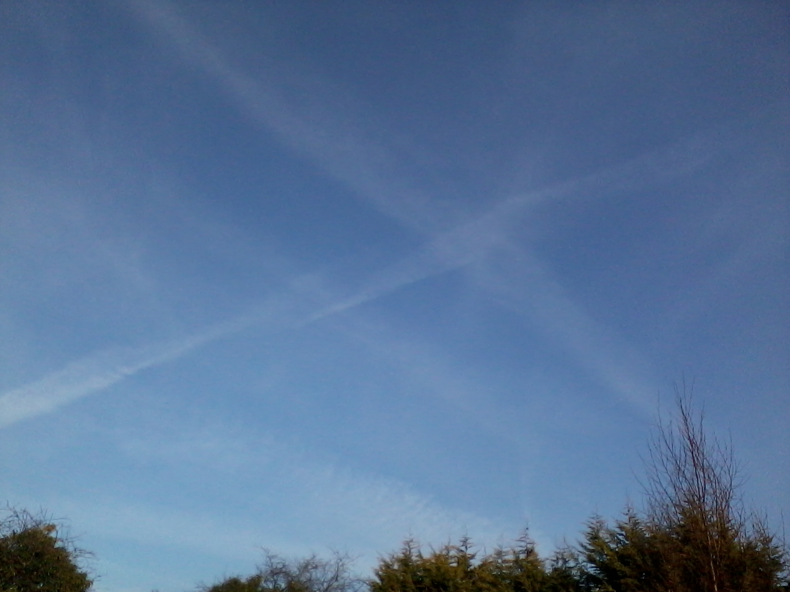 Man I know they could have been miles apart Im not saying they were both at the same height when they intersected maybe intersect not the best choice of words. Im not saying the trails phisically touched, The point I am trying to make is, That many planes should not have been flying all different directions in such a short space of time whatever height they were at. Thats why I suggested flight routes because there is not enough for them to cross over or even appear to cross over in such a small area.