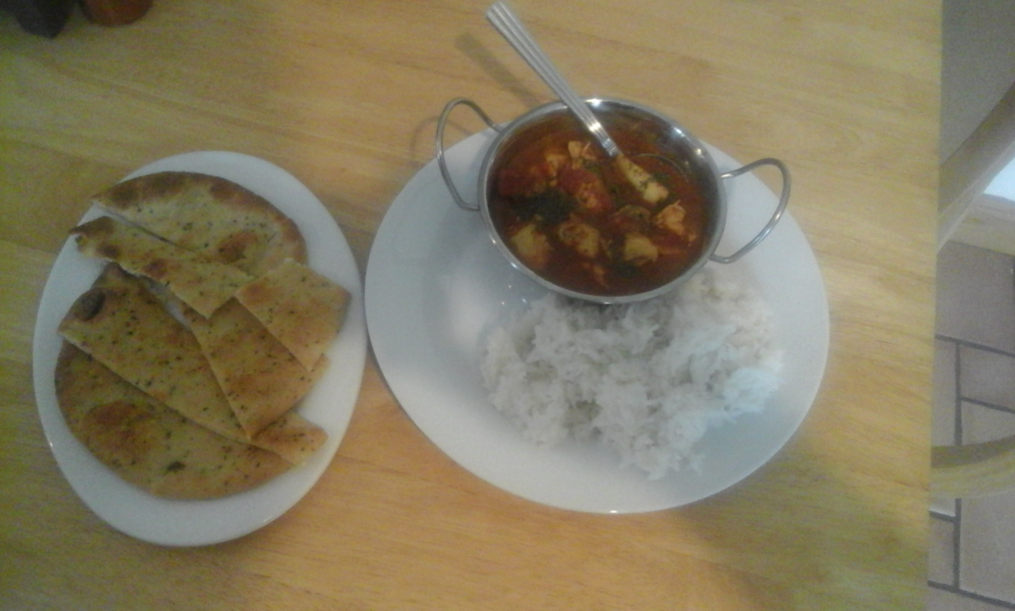 So here's what Mrs G had this evening. Chicken Madras, Basmati rice and Garlic/Corriander Naan bread.