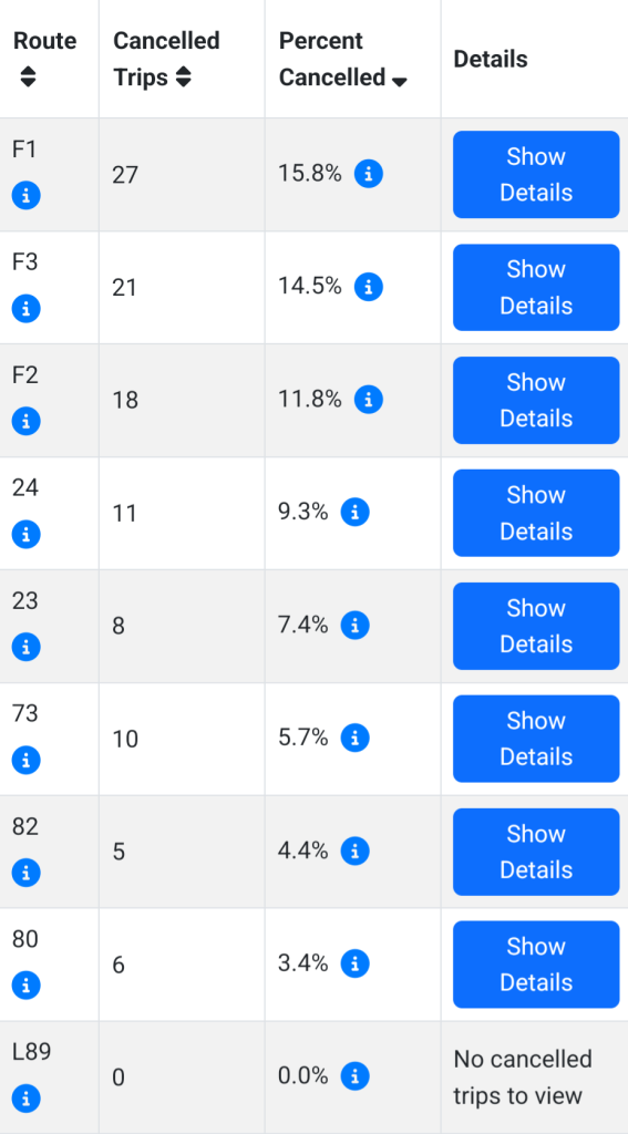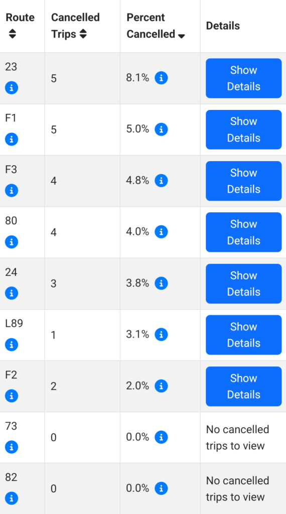 Sunday for comparison is looking better, but also shows how much the 23 is affected by the poor running times. It is mostly partial cancellations, with only a few full cancellations.