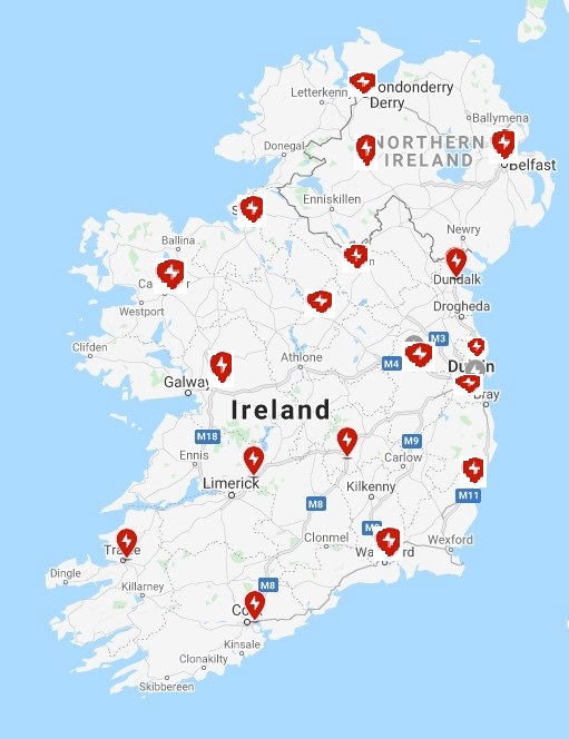 The South East of the country has no superchargers at all and the M9 motorway has zero charging options on the actual motorway until you travel over 100km from the start of it to the Services in Kilcullen and then you only have basically 2 eCars chargers which you will more than likely be queuing for!