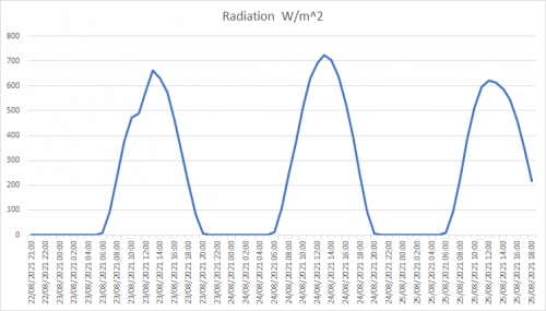That "radiation value" in the xml is pretty neat from Met Eireann graememk. Even if it's (loosely) accurate and gives general trends for the day, it will be pretty useful for building some decision making algorithms. For example, I plotted the solar radiation for me here in south Dublin city for the next 60 hours from the Met Eireann data.