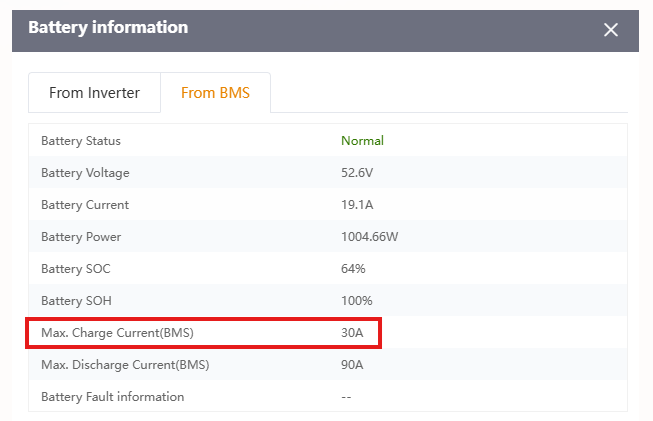 Any thoughts? I'm thinking there is a BMS fault and the inverter is defaulting to one battery. Also, I have read this 30A value is a dynamic value and will change with temps, SOC etc. Does anyone know if this is the case? There doesn't seem to appear to be anywhere, where you can confirm the inverter is seeing all three batteries.