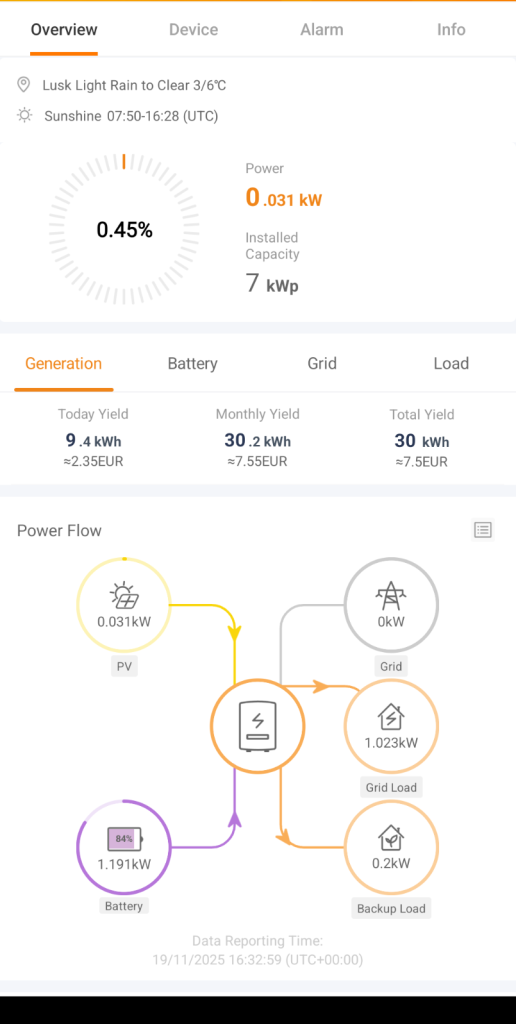 During the initial setup I found one of the supplied comms leads faulty, giving a CAN fault. I replaced this with a temp lead at the temp and all worked well, with batteries charging up to 5kw (3no 5kw dyness batteries). I got the chance to do a permanent job on the patch lead the other evening and it appears the issue is there since.