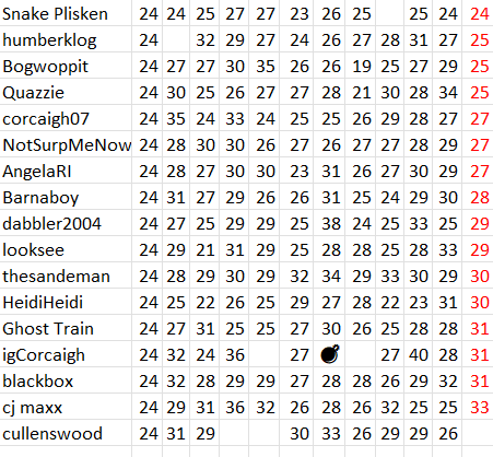 Well done @Snake Plisken, topping the leaderboard second week in a row with 24! Closely pursued by a chasing pack of 3 on 25, mind you…..