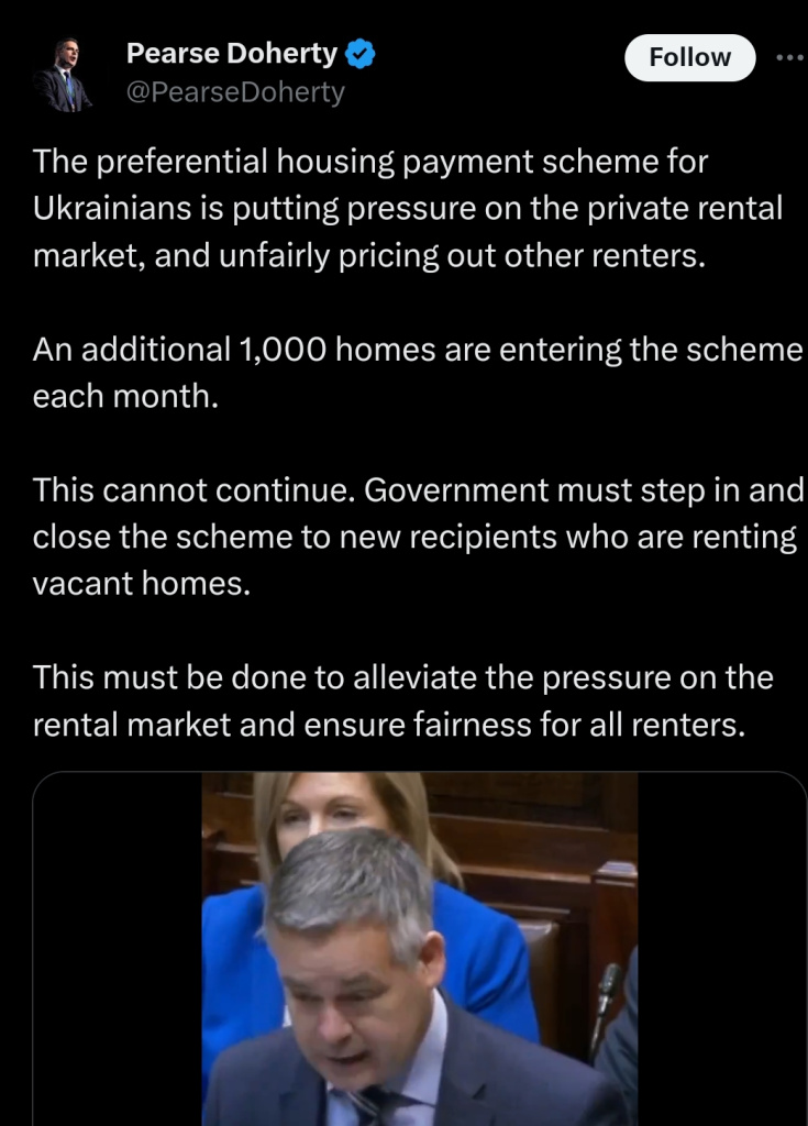 Doherty is blaming the government for this not Ukrainians. And he is not looking for people to be thrown off the scheme but just to stop new applications to it.