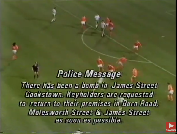 This is a faked up message but in the 1970s and 1980s "Police Messages" on UTV and BBC NI were all too real and often popped up in primetime TV. They'd overlay a message over the live video dimming it by about 50%, they'd usually then mute the programme audio and read out the message which was already on screen