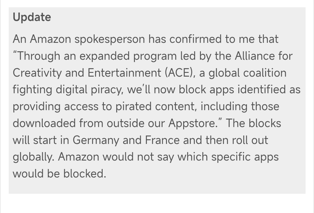 It’ll be interesting to see what apps Amazon choose to block. There are a few legitimate apps out there that don’t inherently provide pirated content and can be used without breaking any copyright laws.