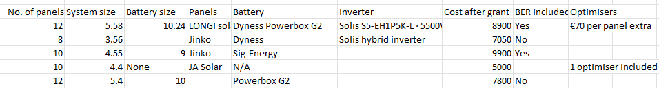 panels fitted(10 east and 10 west) a 10.24kw battery, with back up power socket, Solis inverter, hot water Eddy, Ber cert included and also the grant taken off the price by the company (the grant is being paid directly to them) my final price was €10k