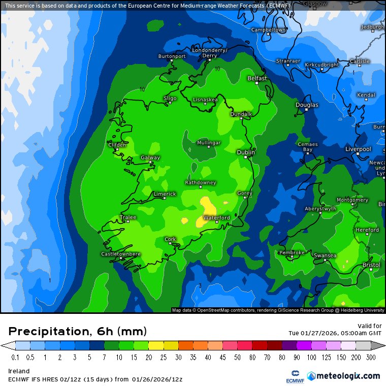 The signal was muted all around on some models including GFS and ECM for yellow warranted totals including counties surrounding Dublin yet they got a yellow warning and Dublin didn't. The below is the wettest 6 hour precip chart from yesterday's ECM 12z with any signal for yellow warranted totals (coincidentally enough also just happens to be yellow on this colour scale) to the south.