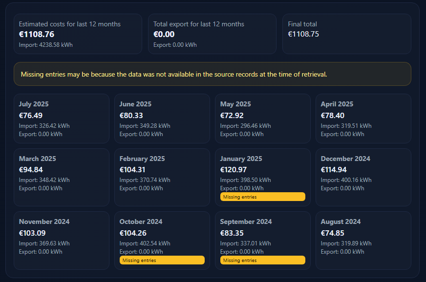 How to handle it? I think the simplest solution would be to assume emtpy cells are 0kWh. It's a coarse solution but the worst you can be off would be around 8kWh and the majority of the time you'll probably have less than 1kWh per day error