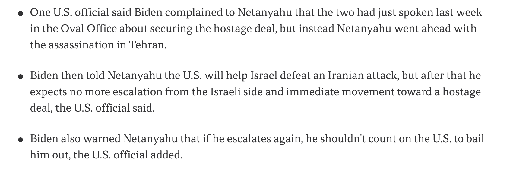 • One U.S. official said Biden complained to Netanyahu that the two had just spoken last week in the Oval Office about securing the hostage deal, but instead Netanyahu went ahead with the assassination in Tehran.
