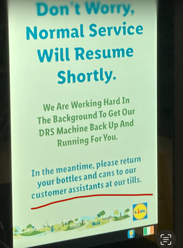this is news to me, Lidl Wexford, one can take their bottles and cans to the till when the machine isn’t working?? And the checkout person scans them or something? Never seen anyone do this
