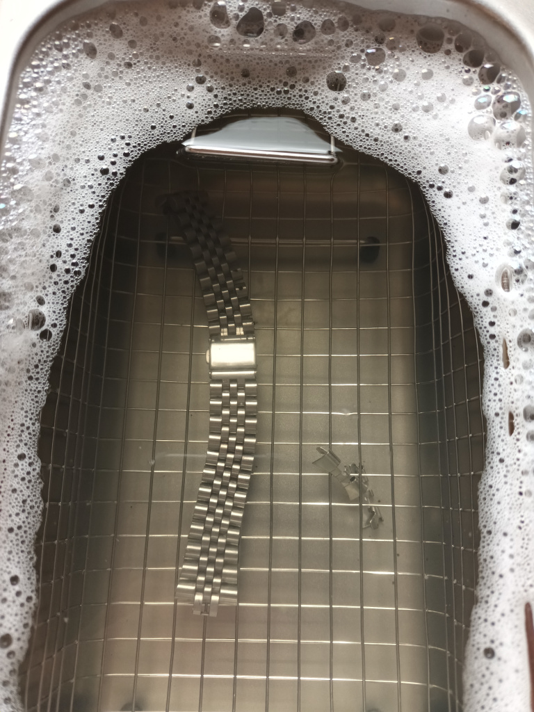 Finished it by masking the sides and polished the three central formerly gold links to a mirror finish. Gave it a dip in my new potent but world loudest us cleaner which fizzed the ever living grime out of it.