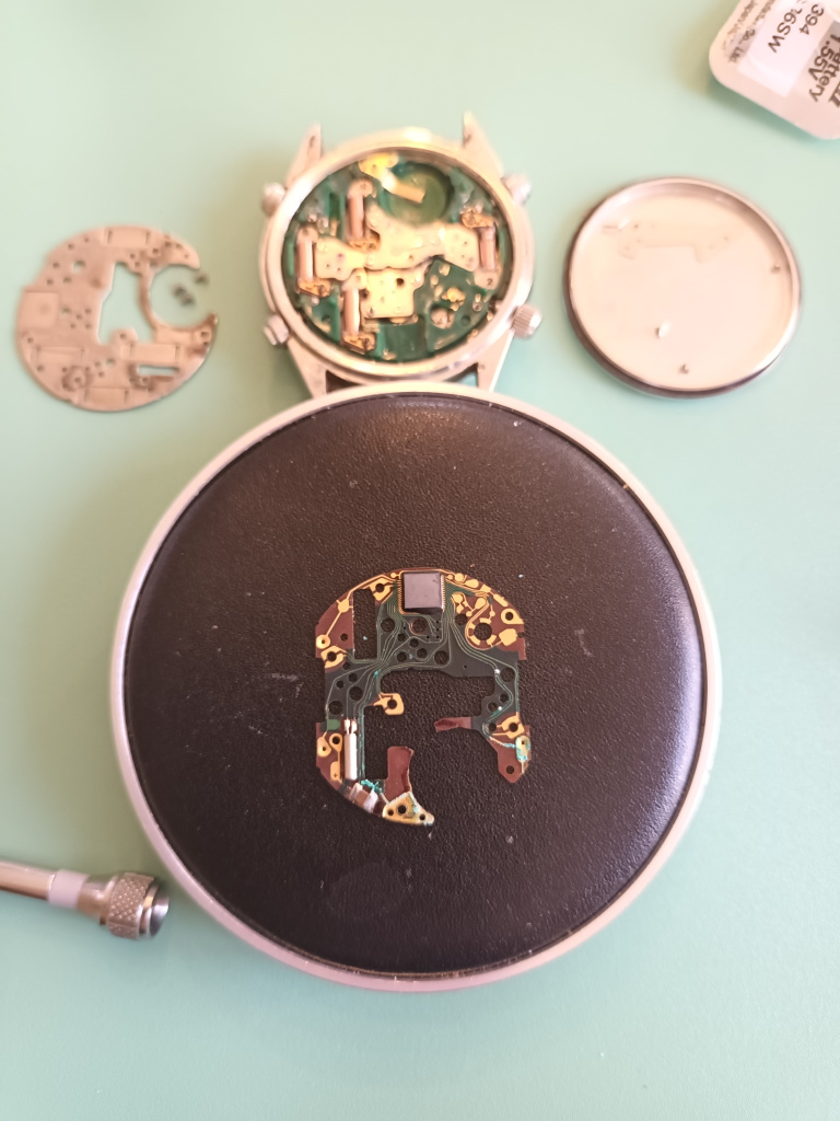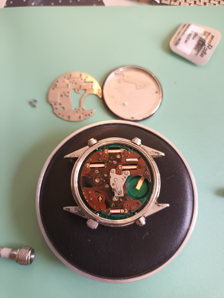 After digging in the pcb is toast, sellers a big fat fibber magee, that was not running. The pcb is potentially fixable, after removing all the corrosion under magnification there's a visible break that could be bridged but I'd rather replace the whole component with a good one. Rest of the watch seems very much unscathed so quite worthwhile.