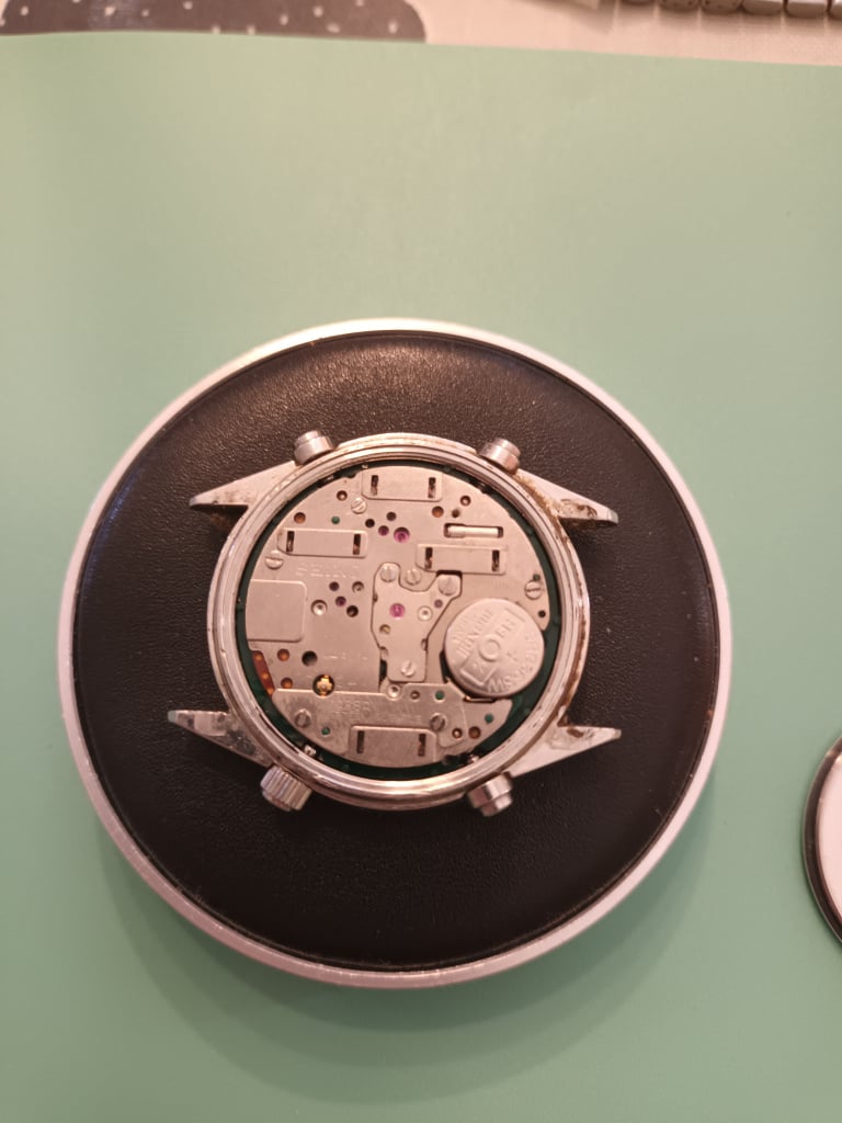 More fun meddling with 7A38's. This one was advertised as a runner with chrono sec hand non functional. When I unscrewed the caseback the central chrono tension finger was absent, easy fix! I raided my nos spare complete movements and swapped one in with a fresh battery fully expecting to turn it over and see it run....but no, mmmmm.