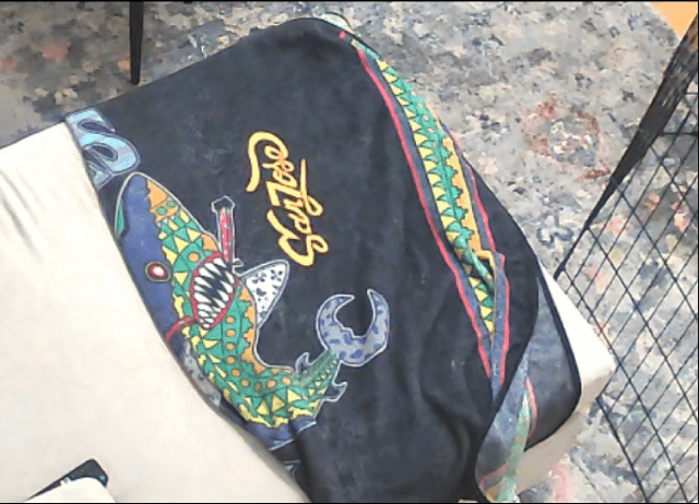 To my eyes, the blanket is black. To the camera in daytime mode it's black too. But, when the camera switched into to night mode and relies on the IR illuminator only, the blanket appears white.