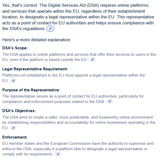 @Enduro See my previous post about bluesky any platform providing access to services and to operate in the EU is required by EU law to have a representative based in some eu country. Where the powers that be can take legislative actions (/fines) against the foreign companies. If not the EU will just block access to the sites.
