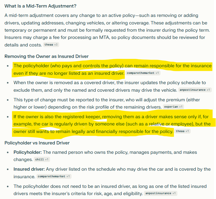 Again that is not what an 'official mid-term adjustment' is dealing with, she will still be the policy holder, but just not an insured driver!