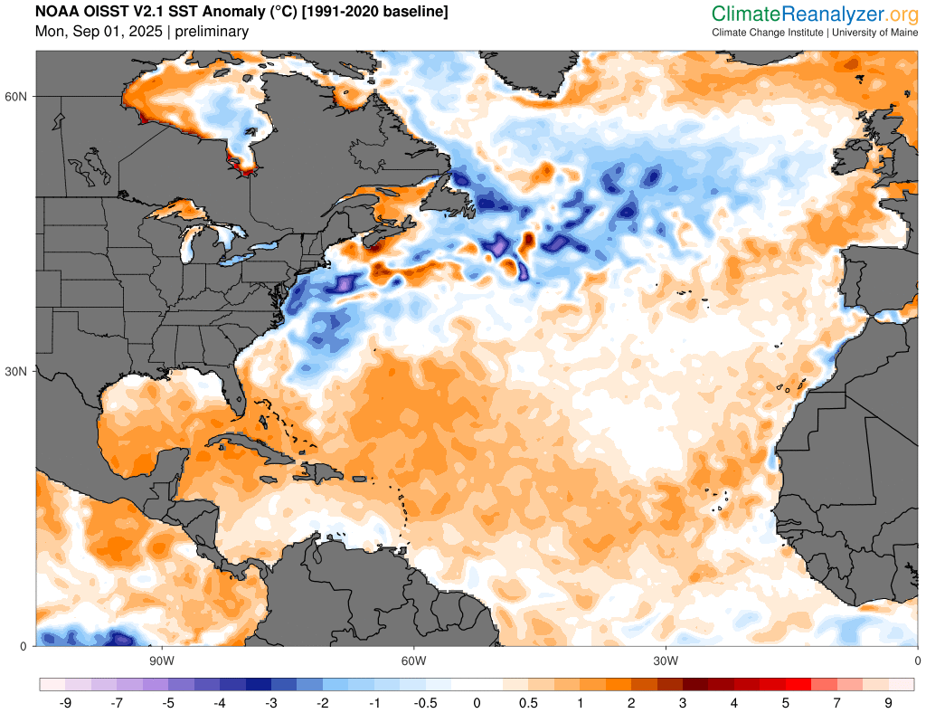 The zonality has reduced sea temperatures in the North Atlantic to now significantly below average to our west but still remain above average in other directions.