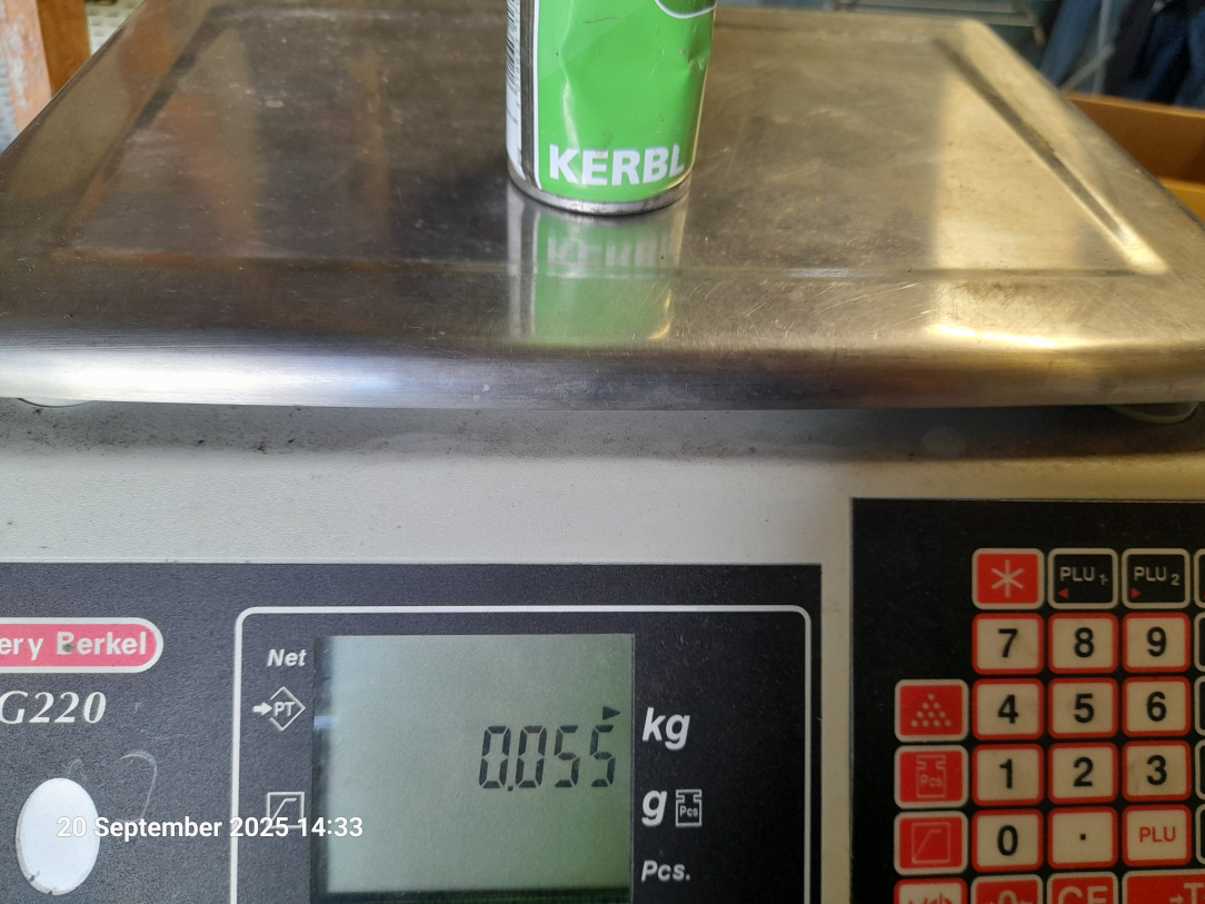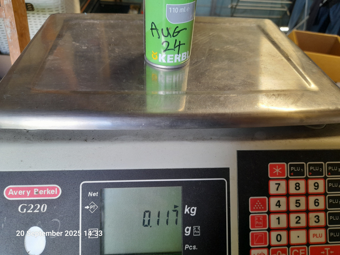 Top one is near full and lower one well used. Weights are with lids on - KERBL bottles.