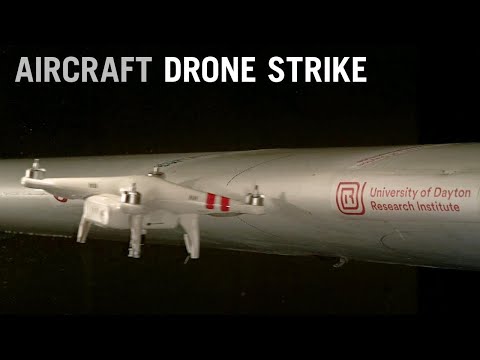 Tests conducted at the University of Dayton in the US mimicked a midair collision between a 2.1lb (1kg) quadcopter and a commercial aircraft travelling at 238mph (383km/h) and appeared to show it inflicting major damage.