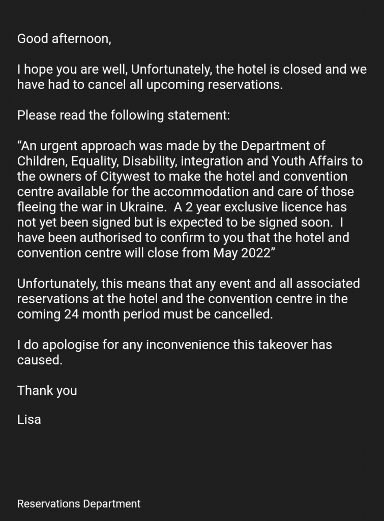 Weren't there a number of local businesses planning on suing the government for loss of business over this? I seem to remember them being very angry that they'd have no tourist business for 2 years because of this. Seems a high price to pay, however many hundreds of thousands, possibly several million to City West hotel and sacrifice multiple businesses and jobs as a knock on effect. Again, most of us have no issue with helping some Ukrainian refugees but this is madness. But hey, they cook lovely food, so maybe there might be some new Ukrainian takeout food places opening where the ones forced out of business are.
