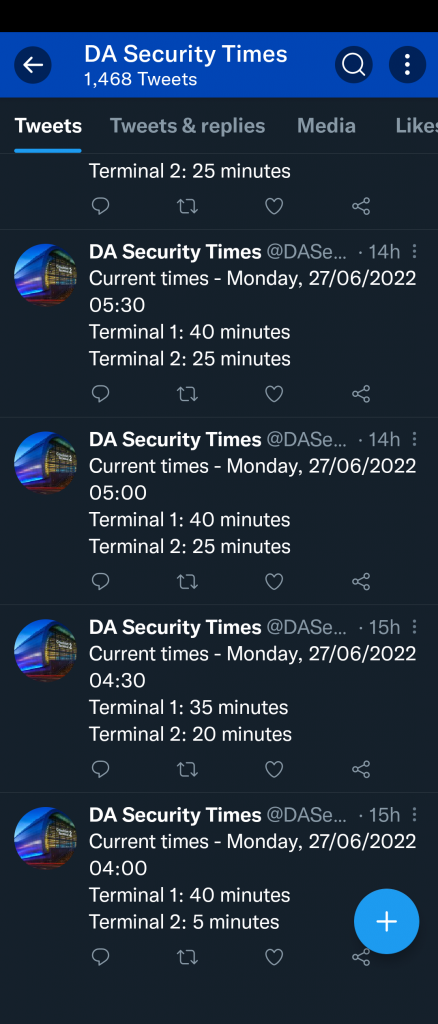 Passed through T1 yesterday at 2pm, queuing time was advertised as 35 mins but took 75 mins in the end. My carry on bag had extra screening which took forever even though I'm a regular flyer and had nothing out of the ordinary in it. It was annoying but I'm quite happy they were thorough at the same time. The departure area was chaotic with hardly anywhere to stand, nevermind sit with 4 gate changes for my flight. Got away in the end with a delay of 2 hours so not the worst.