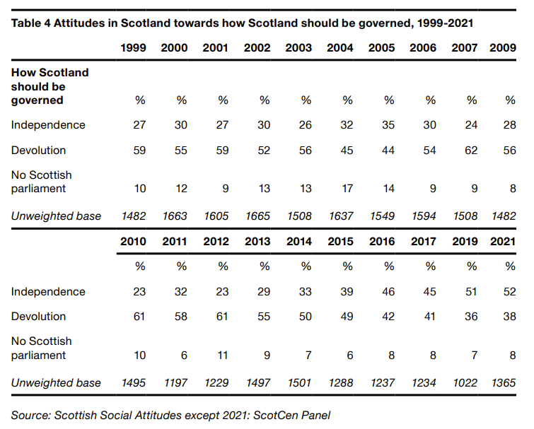 Latest British Attitudes Survey data has been released. It was conducted last year but published today. Support for Scottish independence is at a record number.