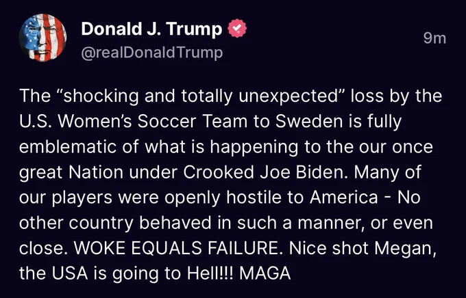 He is seriously blaming the US women's team being knocked of the the World Cup on Biden