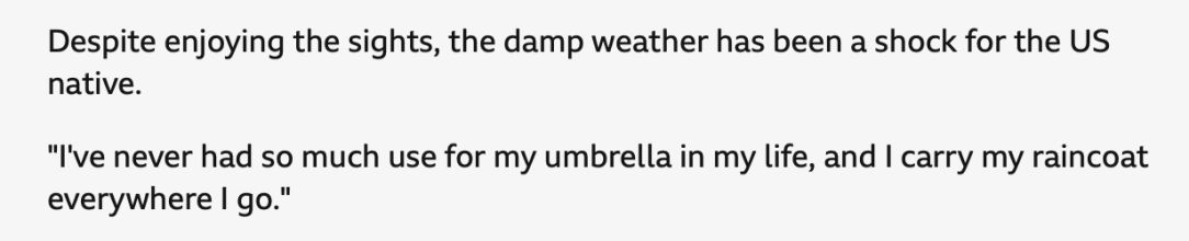There was a debate a few pages back about US tourists' opinions of Ireland's weather with some saying it wouldn't faze them. And funnily enough there was an article on the BBC with a tourist's opinion lol :-