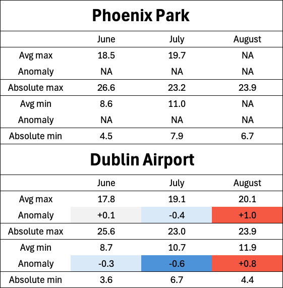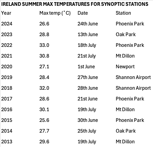The synoptic station max in Ireland this summer was just 26.6C at Phoenix Park on June 24th. This is the lowest summer absolute max temp in Ireland since 2015. 2015 had a max of 25.6C at Phoenix Park on June 30th.