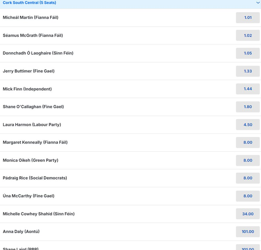 Surprised by the Mick Finn odds too. I understand that Independents are doing well in the polls but that doesn't necessarily mean that whatever independent is in the running will be getting elected. He topped the poll in his LEA a couple of times so could obviously pull quite a few votes there but I'm not sure how much support he'd get from the rest of city areas or the county parts of the constituency.