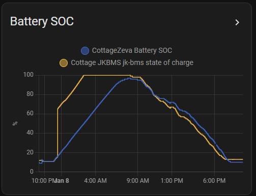 Fairly confident on the zevabms measurement, Ive calibrated the Voltage and current on the JK too. So now im tweaking the capacity of it to track the Zeva SOC (currently set at 315 on 280ah cells!)
