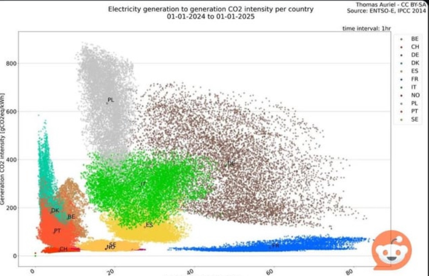 From these two graphs for 2024 it’s abundantly clear that the only European countries that are both cheap and green (often by order of magnitude) are those that embraced some amounts of nuclear power (France, Finland etc)