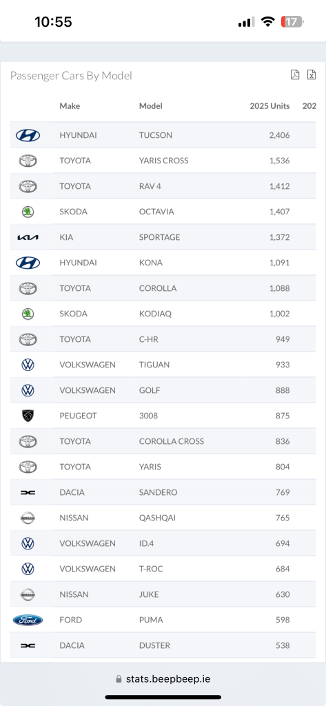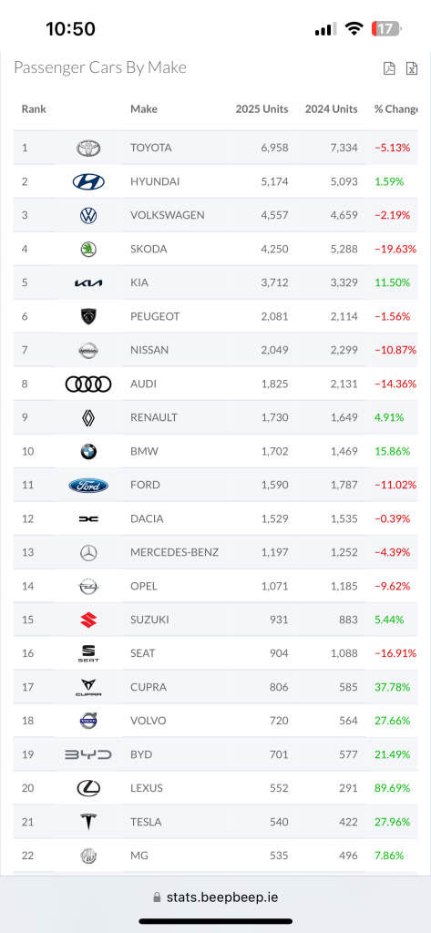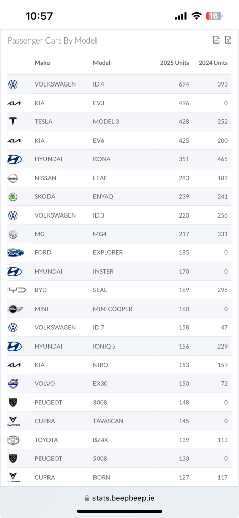 Tesla had their delivery on model 3’s for Feb, they’re still down in 21st of the top selling marques, but up year on year by about 100 cars. The Y sales are nowhere, but not much change from last year due to delivery schedules out of sync with the Irish market.