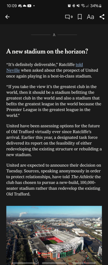 “United are expected to announce their decision on Tuesday. Sources, speaking anonymously in order to protect relationships, have told The Athletic the club has chosen to pursue a new-build, 100,000-seater stadium rather than redevelop the existing Old Trafford.”
