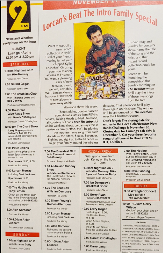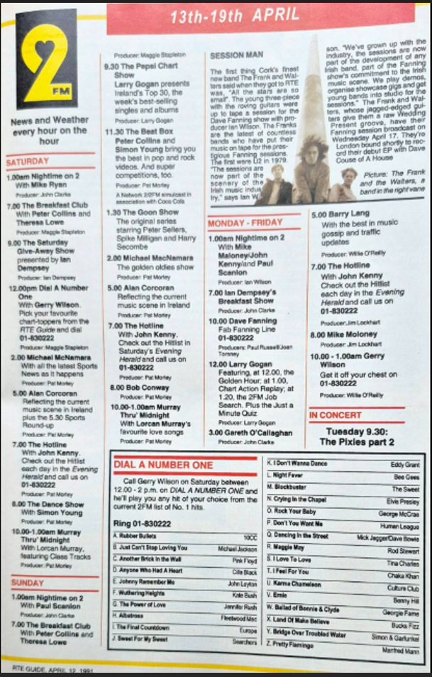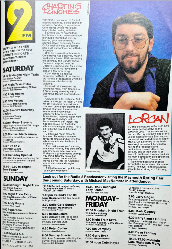 2FM schedule April 1991 - I don't remember Mike Moloney filling in for Fanning back in the day. Pat O'Mahony used to be a regular fill-in for him and later on in the 90s Mr Spring.