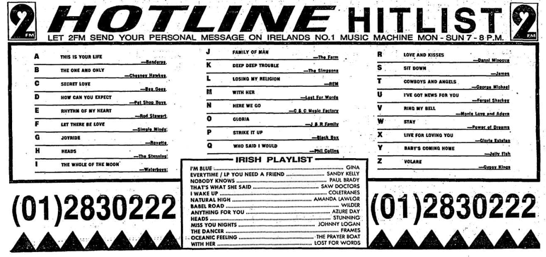 Jesus back in the day 2FM literally played anything - such as middle of the road / Irish country …look at Johnny Logan, Sandy Kelly and also Gina on the Hotline Hitlist !!!