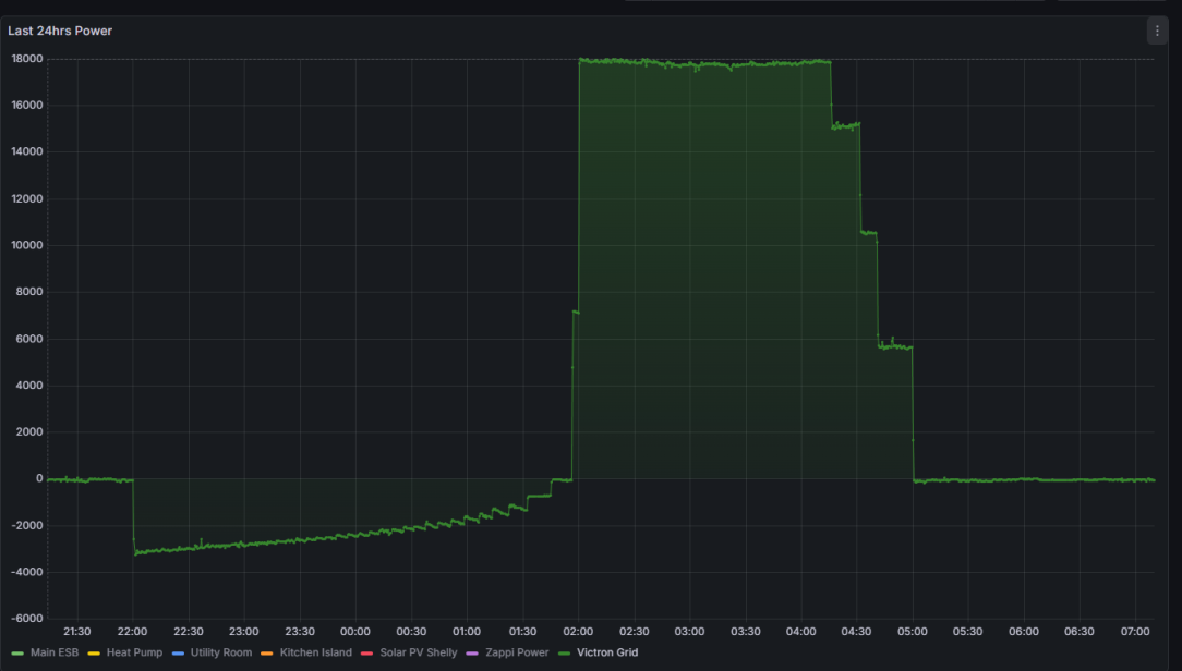 Really happy with my force discharging logic, at 10pm it calculates how much it needs to discharge to get to the set SOC by 2am. It then recalculates this every minute, so as you can see from yesterday it starts off discharging around 3kW but this slowly decreases to be at zero grid export by 2am…..then boom! 18kW