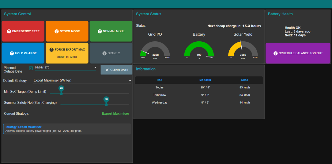 • Summer Mode – Charges at 2-5am but I have a slider where if the battery is over for example 60% it won’t charge the battery from excess solar it will go straight to grid to save on inverting losses.