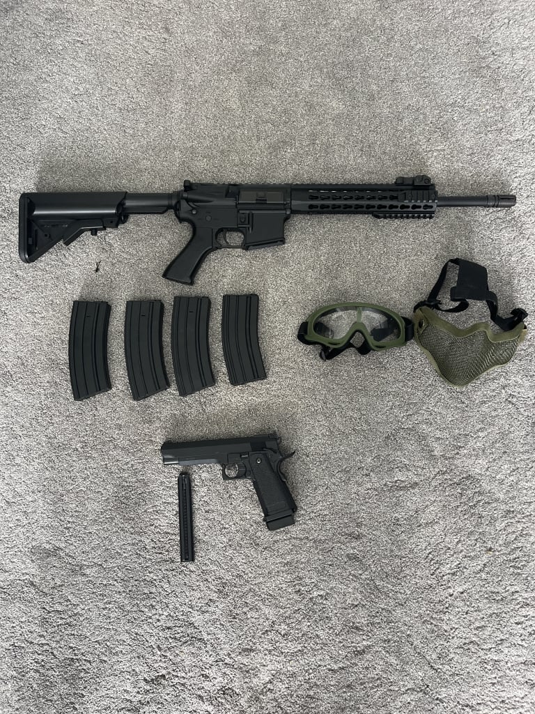 CYMA M4 with magazines, CYMA electric pistol, and protection gear