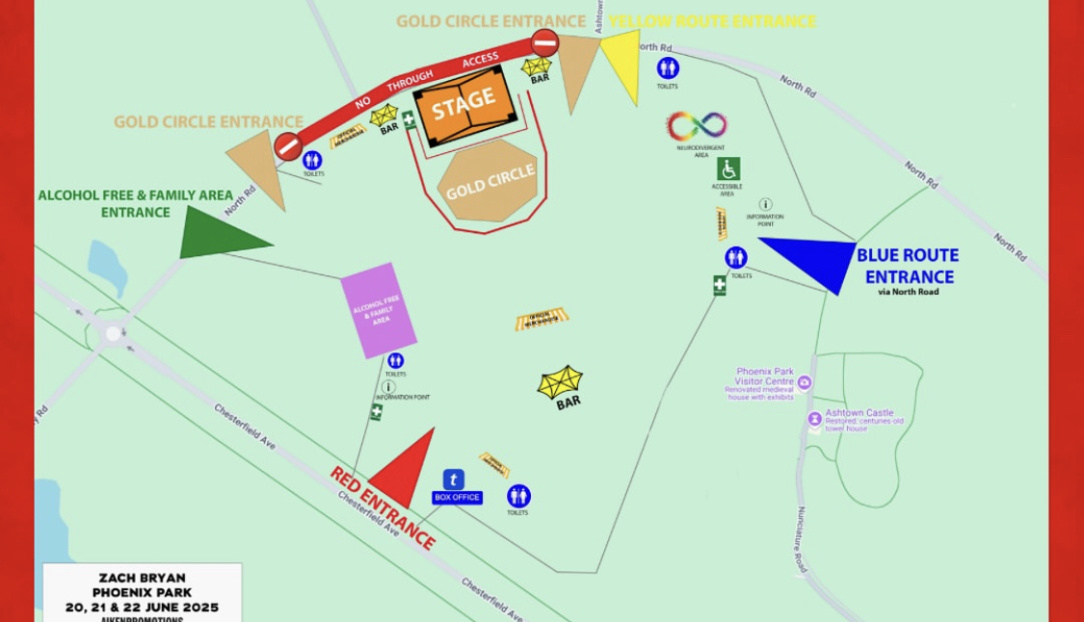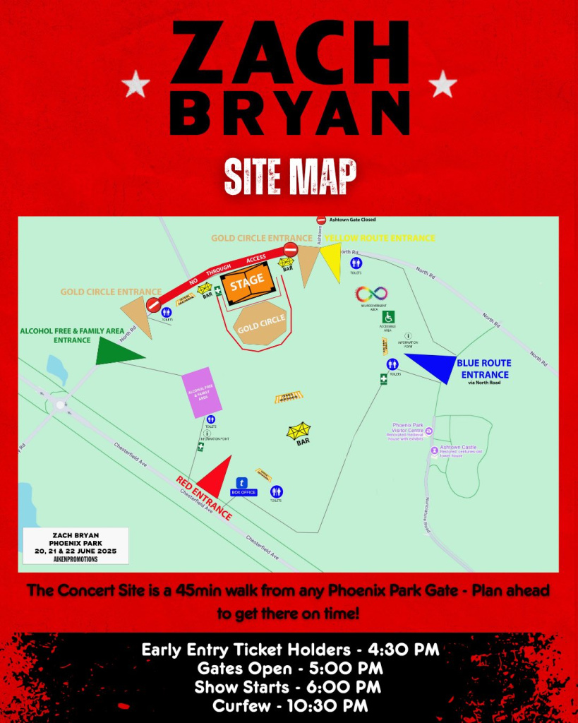 Aiken's FAQ state that "Please note that there is a 45-minute walk from the Phoenix Park entrances to the venue site.".