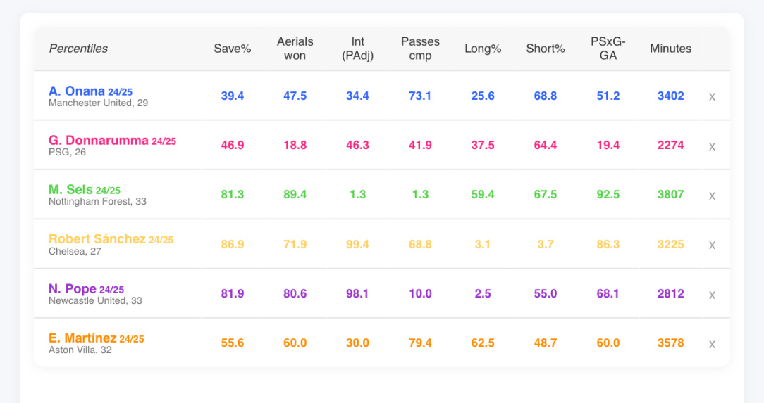Comparing Donnarumma with Onana but also the goalkeepers of the teams 4th through to 7th last season highlights some issues. Particularly with the aerial side of things. Save percentage isn’t as good as you’d expect from a ‘massive upgrade’ and neither is goals prevented from expected goals.