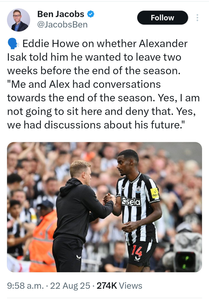 Given Isak's statement I think it will be very difficult for Howe to smooth things over with the Newcastle supporters in the event that a transfer doesn't happen.