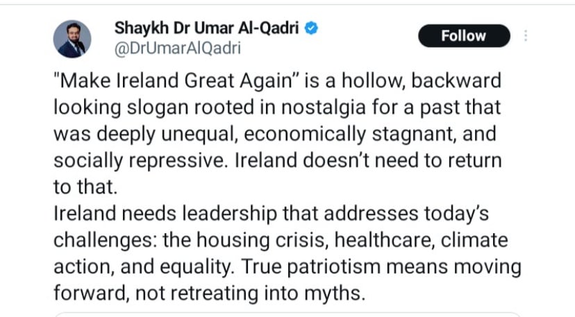 In fairness to Al Qadri, while he maybe more hardline than a Free Presbyterian on many issues, he's still the closest thing we have to a spokesperson for moderate Islam. And seems genuinely concerned about immigrant integration issues, and potential violence outbreaks.