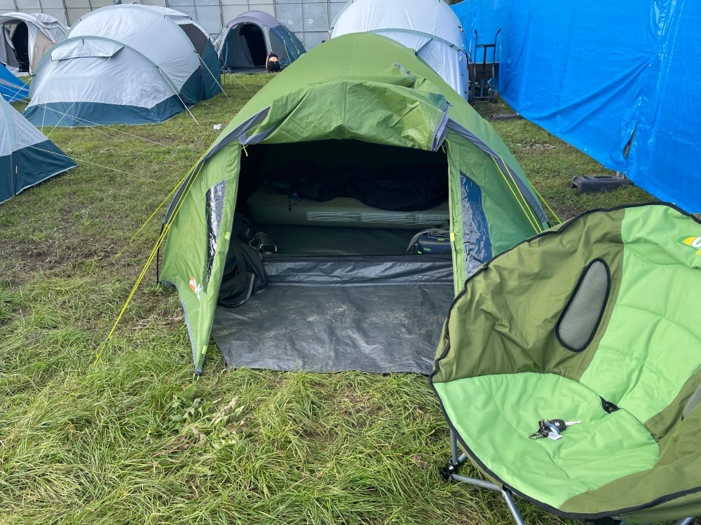 Do not bring gazebos or similar structures, you're just eating valuable and now limited camping area. Also many larger tents and gazebos suffered damage due to the high winds this year, smaller (and you can get 4 man versions) dome tents have a big advantage here if pegged (heh) into the ground correctly.