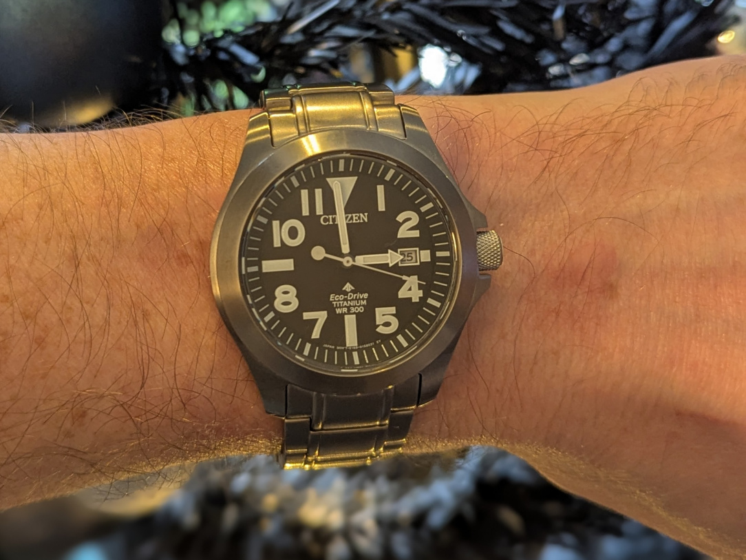 After nearly a dozen years of flawless Eco-Drive ownership, I need a new daily driver. (it got accidentally flung very hard across the room onto a tiled floor, landed on the crown, looked ok, ran a bit slow and when I tried to adjust it the crown came off in my hand)